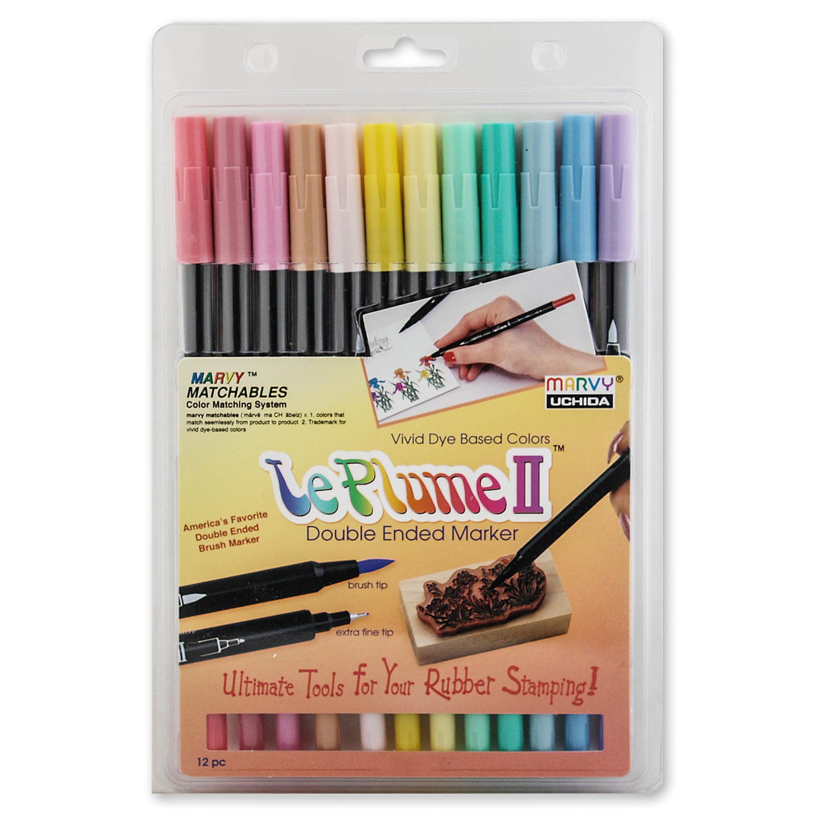 This collection of watercolor markers ideal is for art, illustration or rubberstamping. Each pen has one medium brush point and one extra-fine plastic point. The brush tip is large enough for direct use on rubberstamps. The plastic tip is great for fine detail work, and the colors blend beautifully for an endless color palette. This set includes black, red, blue, green, yellow, brown, orange, violet, pink, light blue, light green and gray.Uchida Le Plume II Double-Ended Watercolor Marker Set, 12-Colors, Primary
