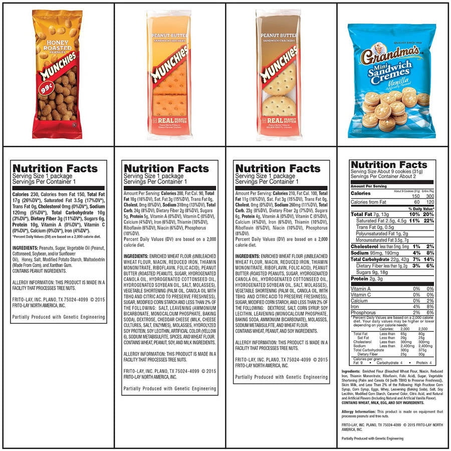 Each box is filled with an assortment of crave-worthy items that address any craving. The snack care package includes the following assortment:(4) 1 oz. Bags of lays bbq potato chips, (4) 1 oz. Bags of Doritos nacho cheese tortilla chips, (2) 1 oz. Bags of Cheetos crunchy, (2).75 oz bags of funyuns onion flavored rings, (2) 1 oz. Bags of rold gold tiny twists pretzels, (2) 1 oz. Bags of Chester’s flaming hot fries, (2) 1.75 oz. Bags of munchies cheese fix snack mix, (2) 1.375 oz. Bags of munchies honey roasted peanuts, (3) 1.42 oz. Packs of munchies peanut butter on cheese crackers, (3) 1.42 oz. Packs of munchies peanut butter on toast crackers, (2) 2.12 oz. Packs of grandmas mini sandwich vanilla cremes, (2) 2.5 oz. Packs of grandmas home-style oatmeal raisin cookies, (2) 2.5 oz. Packs of grandmas home-style chocolate brownie cookies, (2) 2 oz. Packs of grandmas mini chocolate chip cookies, (2) 1.25 oz packs of cracker jacks original, (2).625 oz. Packs of smart food white cheddar popcorn, (2) 1 oz. Sticks of matador jerky.