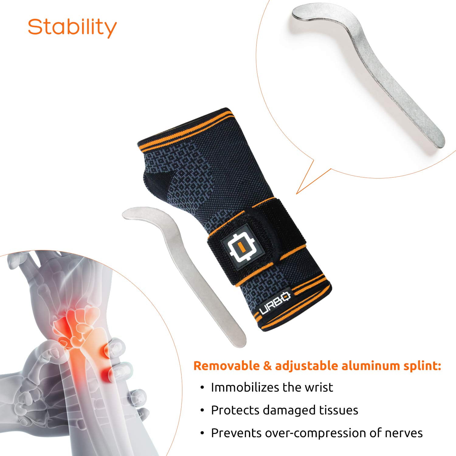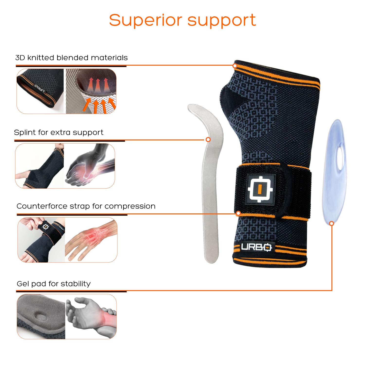 Rest easy with Urbo’s 1-year Worldwide Warranty which automatically extends to 2 years when warranty is activated online. (However, we wish you a speedy recovery and hope that you won’t need such a long warranty).✔ WRIST EASY: 3D knitting, gel pads and composite blend of premium materials & COPPER makes the Urbo® wrist brace breathable and odor-resistant. Specially contoured for extensor and flexor muscles in the human wrist, the brace does not chafe the skin nor does it bunch up or shift during normal hand movements.✔ ERGONOMIC COMFORT: Ideal for desk-bound workers and almost anybody dealing with repetitive use injuries and needing the comfort of a brace that supports their active lifestyle. Counterforce strap helps adjust compression and reduces stress on tendons.✔ THINK TANK: Conceptualized and created by a multidisciplinary team consisting of orthopedic professionals, textile engineers, product designers, athletes and occupational health specialists.✔ WRIST SPLINT SUPPORT: 3D cushioning and integrated manufacturing process combine to provide firm thermoplastic rubber gel pads for optimum balance between rigidity and comfort. Removable and adjustable aluminum splint for extra support.✔ CERTIFICATIONS & SERVICE: Manufactured in adherence to GMP, ISO 13485 and CE guidelines and FDA approved. Backed by Urbo’s reliable and friendly support.