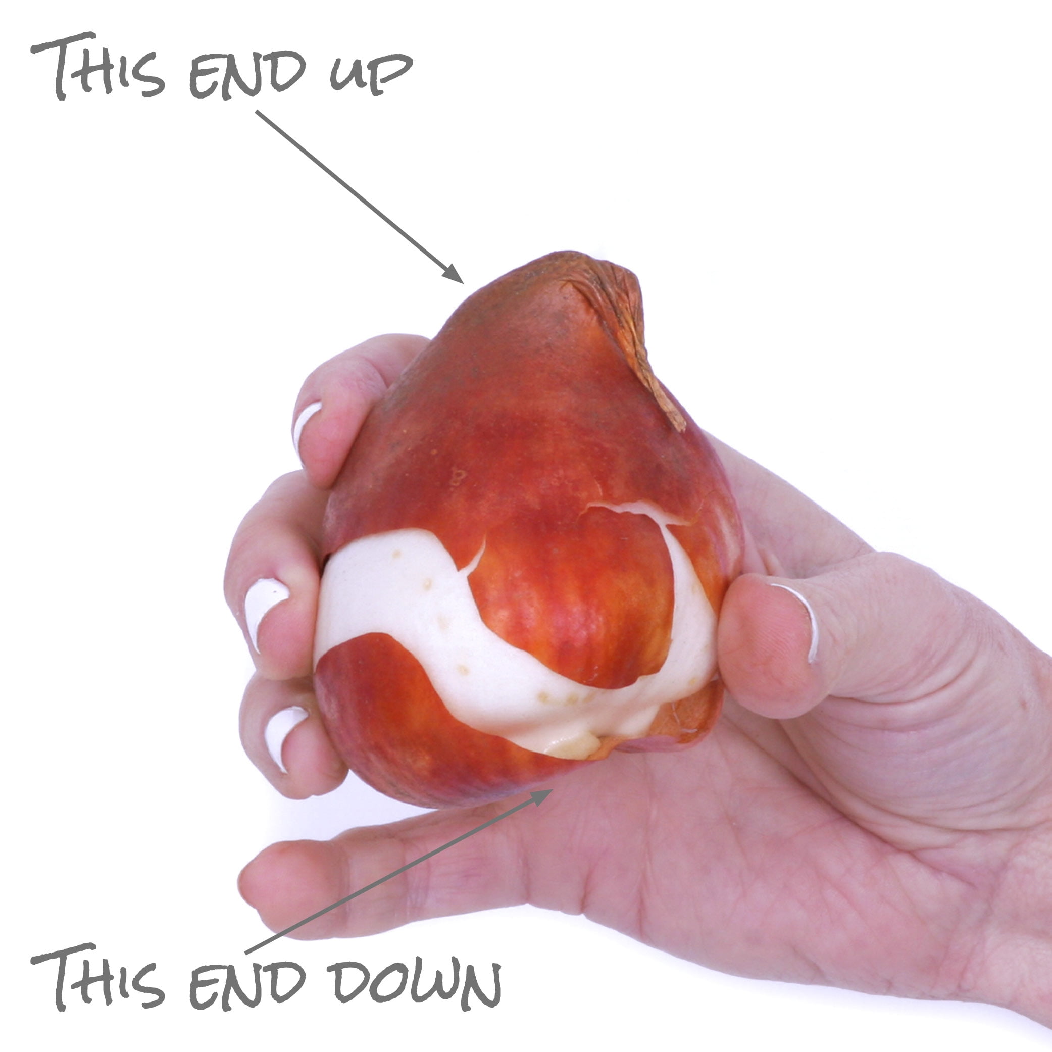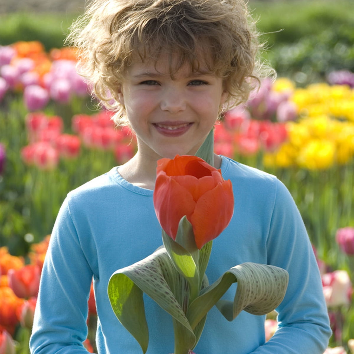 Tulips are the indispensable blooms of the spring garden, as they bring it to life! They are unique in the range of size, shape, and bold color found in almost every color spectrum, that only tulips provide. Tulips are suitable for a wide range of plantings, are excellent in the rock garden, in formal beds, as elegant cut flowers, and for containers. They can be used in nearly any garden design scheme. Flowers are upward facing, with linear to lance-shaped green leaves on the stem. Tulip descriptions can become quite technical, as they are grouped into 15 different divisions, describing the petals, stamens, and leaves in detail. Plant several different varieties of tulips throughout the garden to extend the blooming time. The tulip Giant Orange Sunrise produces the "World’s Largest Tulip" blooms. This tulip is a true giant which produces blooms sized 9-10". Its’ foliage is variegated purple atop a muted silvery sheen. It makes for a great cut flower and known as the official 11 Yr. Wedding Anniversary flower.
