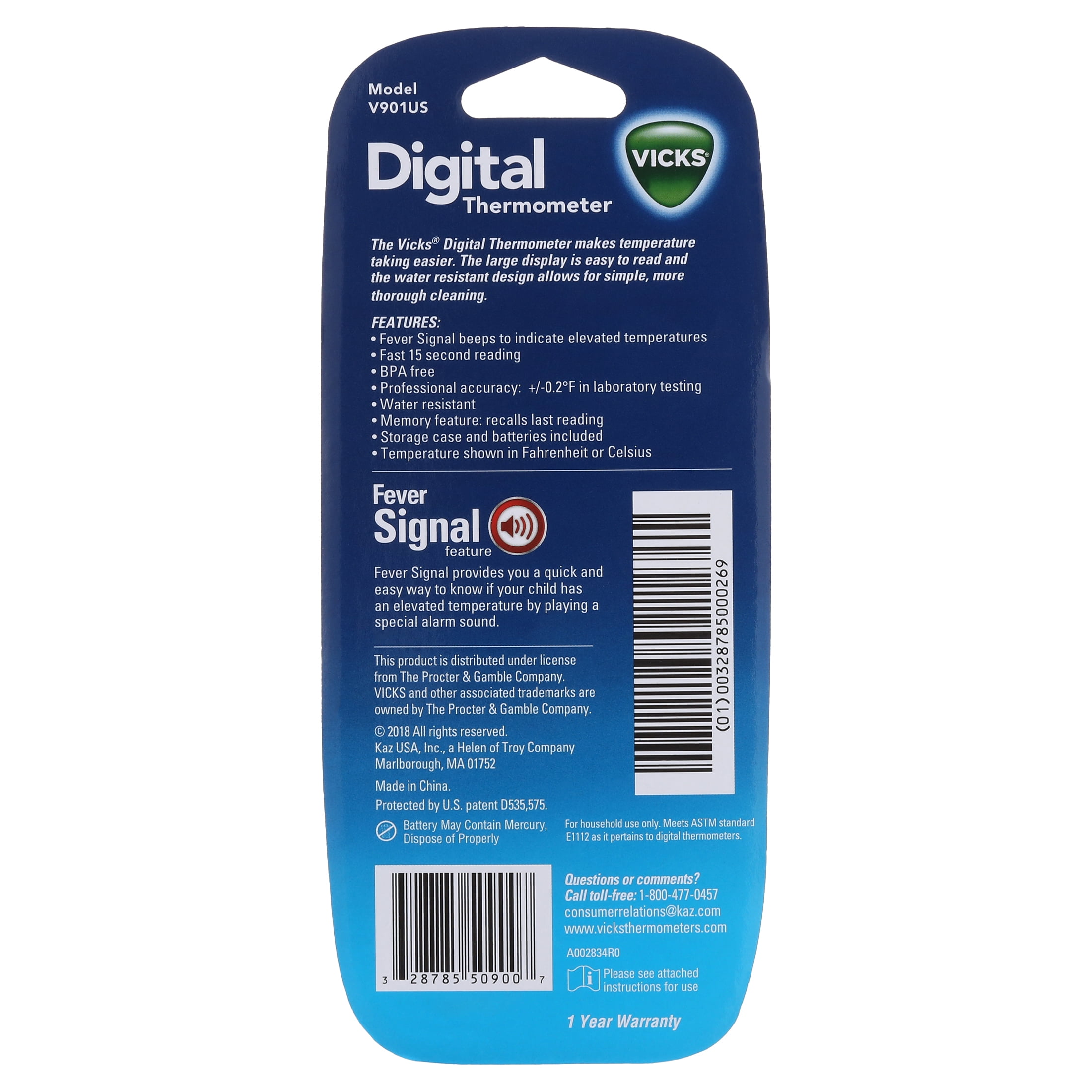 Model V901. Fast and accurate. Mercury free. Easy-to-read display. Beeps when ready. Waterproof. For oral, rectal or underarm use. The Vicks Digital Thermometer makes temperature taking easier. The larger display is easy to read and the waterproof design allows for simple, more thorough cleaning. Features: Fast and accurate, a reading within +/- 0.2 degrees F in 60 seconds. Beeps when temperature has been reached. Waterproof, for easy, more thorough cleaning. Automatic shut-off for longer battery life (battery included inside unit).