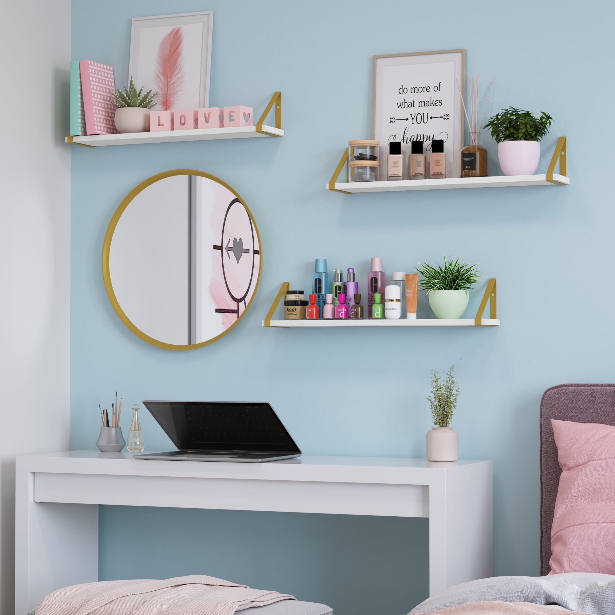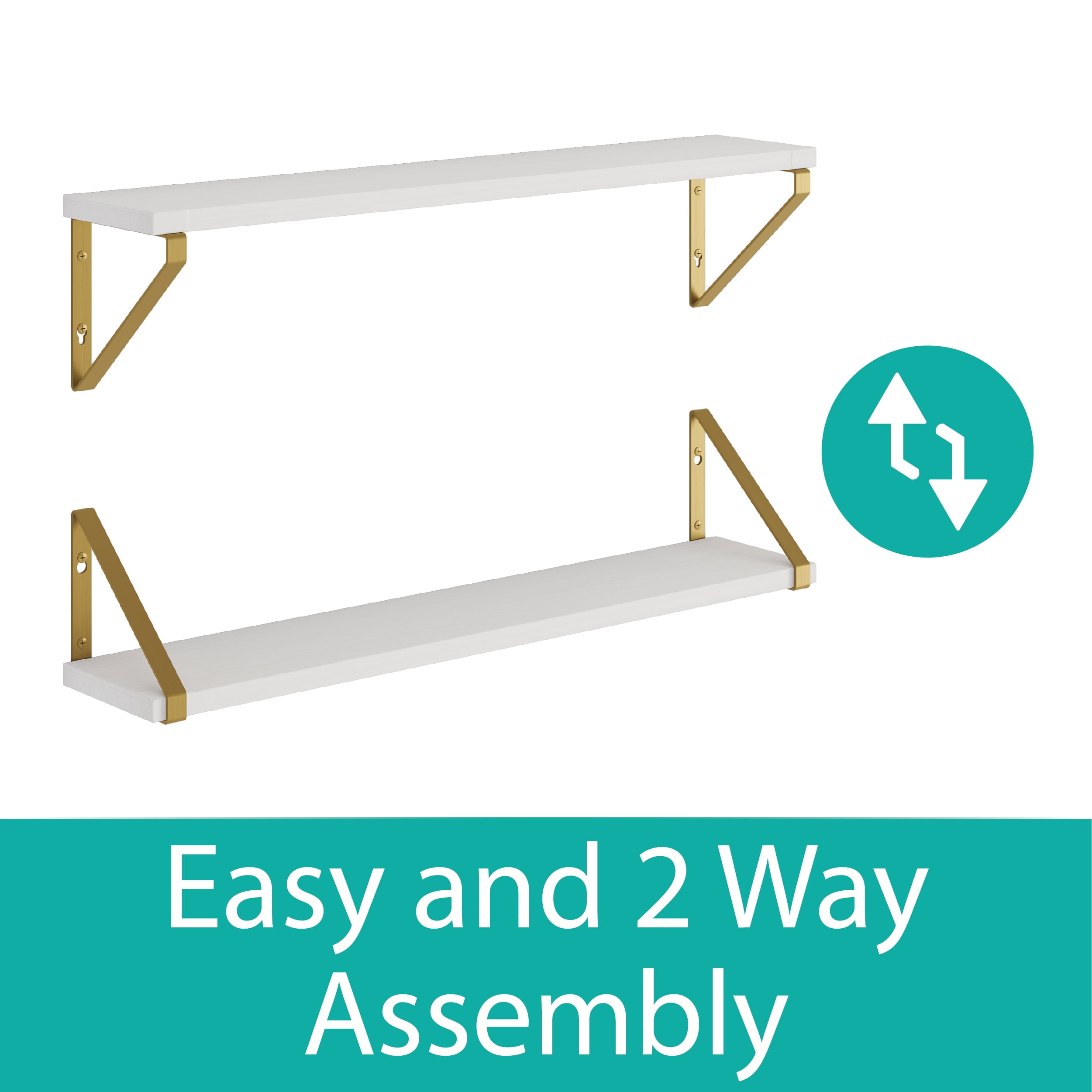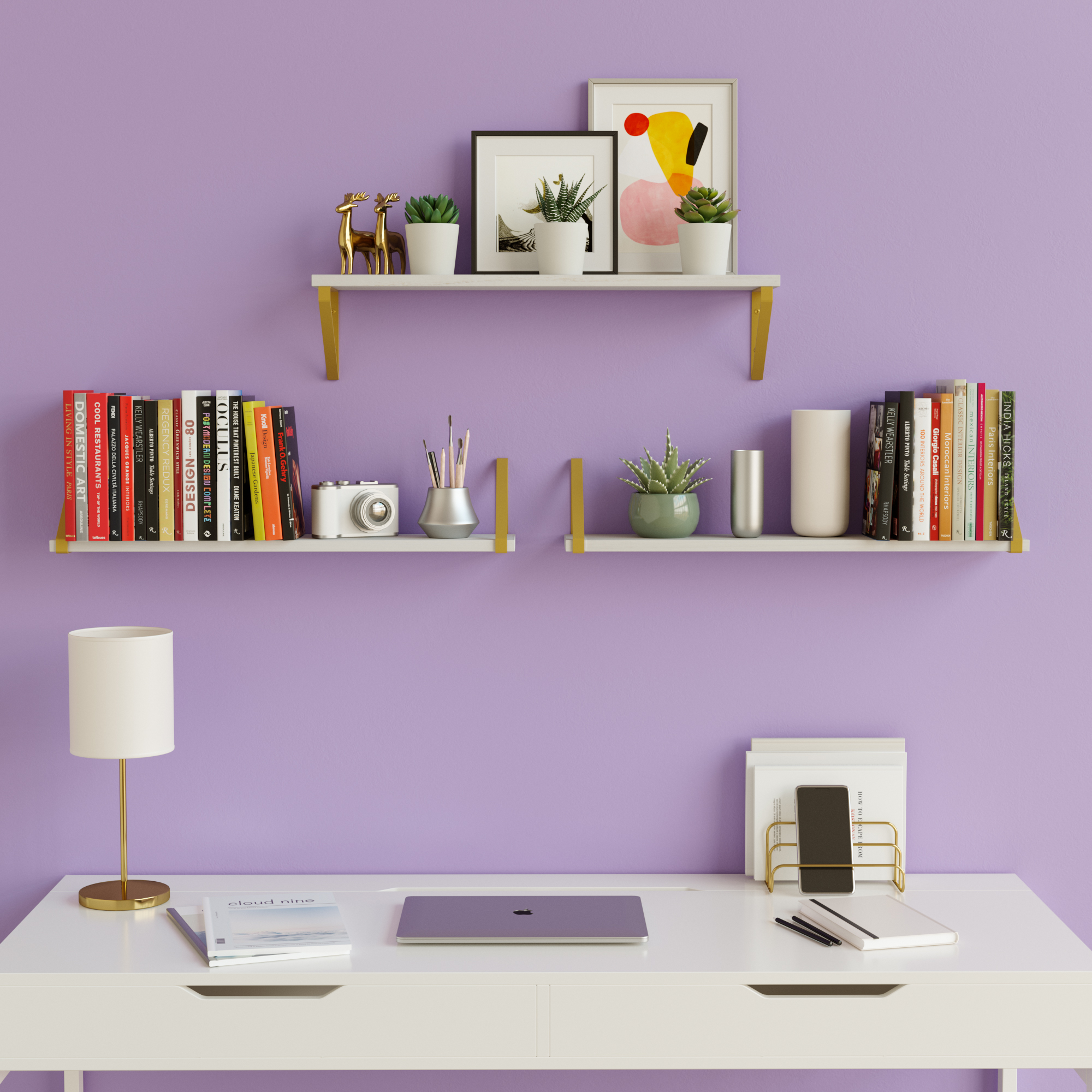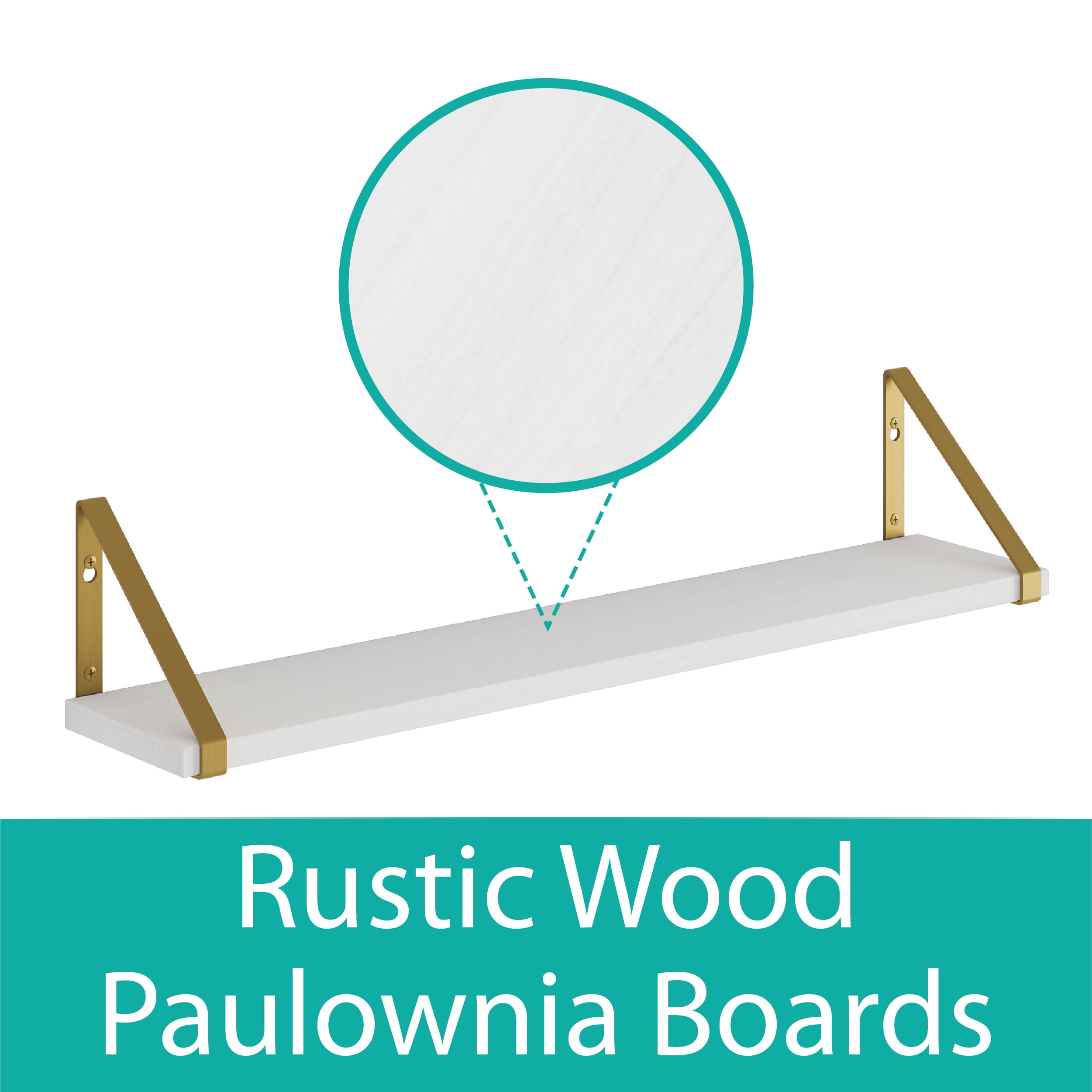 Set of 3, Wallniture PONZA Living Room Floating Shelf Natural Wood with Gold Brackets, 24" x 4.5", White Finish