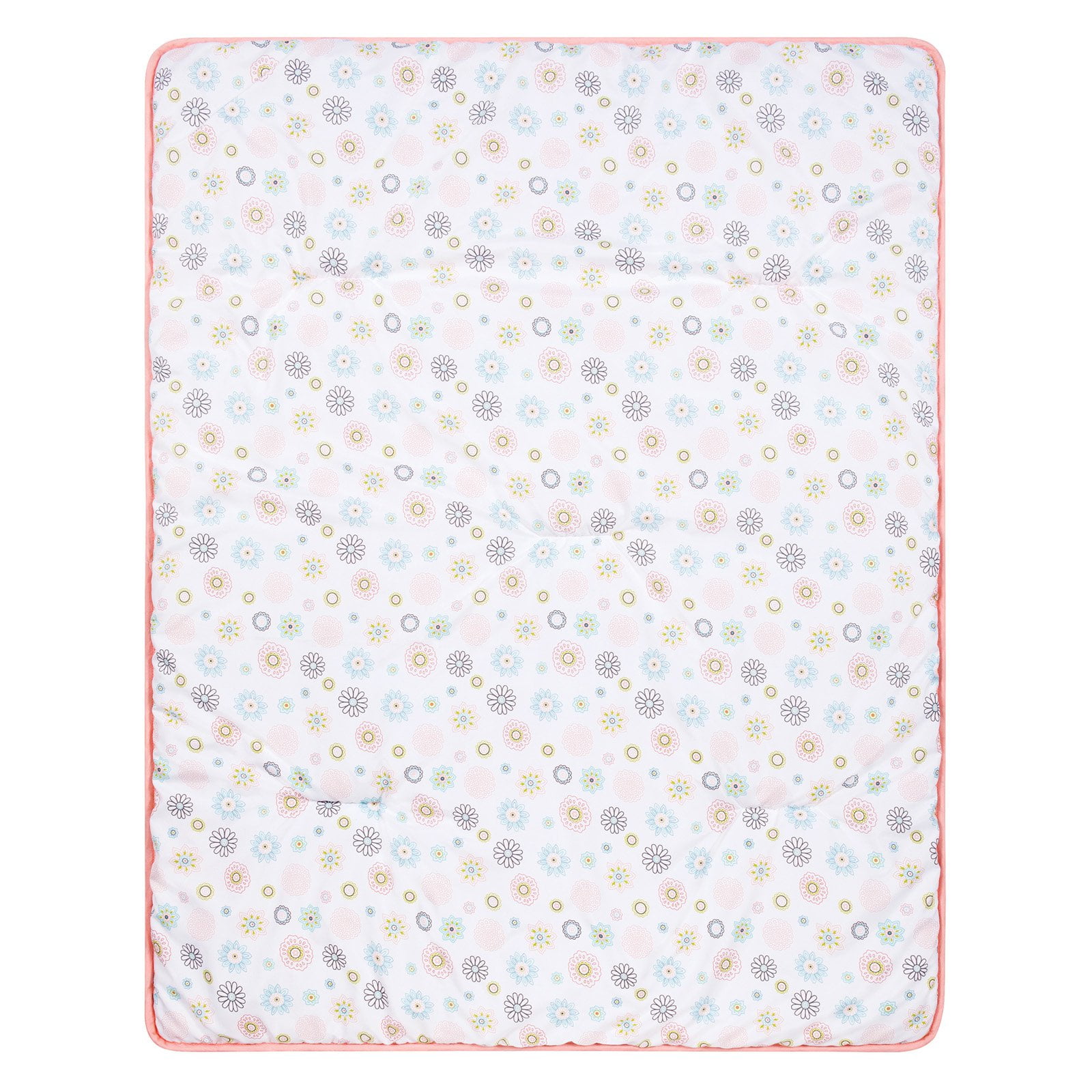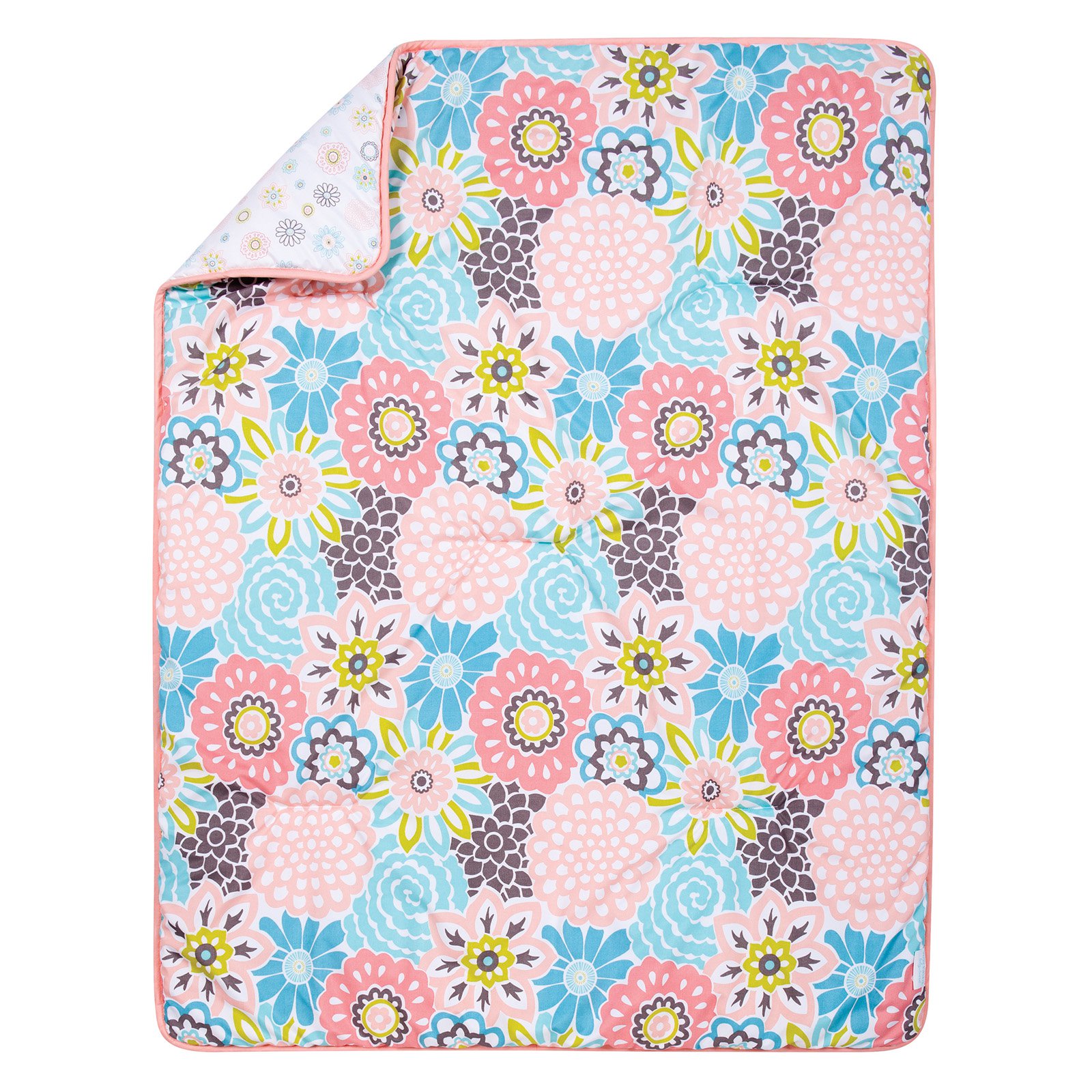 Waverly Blooms 5 Piece Crib Bedding Set by Trend Lab. Brighten up your little girls nursery with this gorgeous reversible floral print quilt. The color palette is a vibrant mix of hues coral and turquoise, with accents of gray and green. Set includes: Quilt, Crib Skirt, Fitted Crib Sheet, Changing Pad Cover and Diaper Stacker. Perfect for your girly girl. This collection will complement your home décor beautifully.