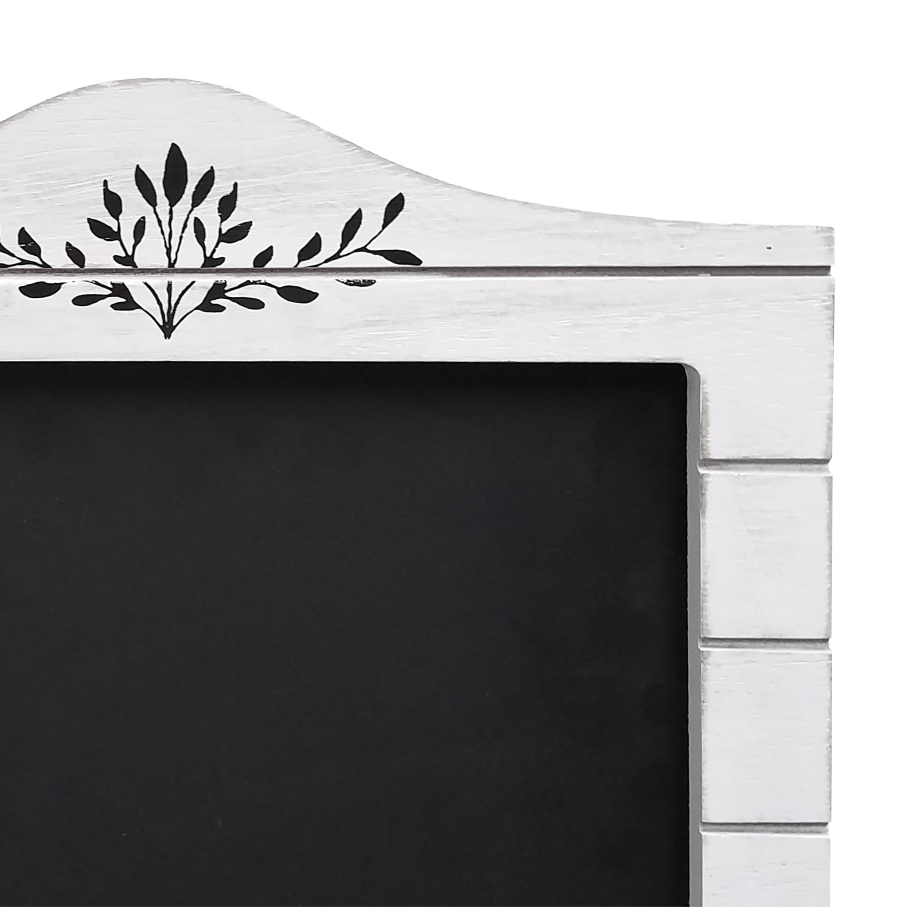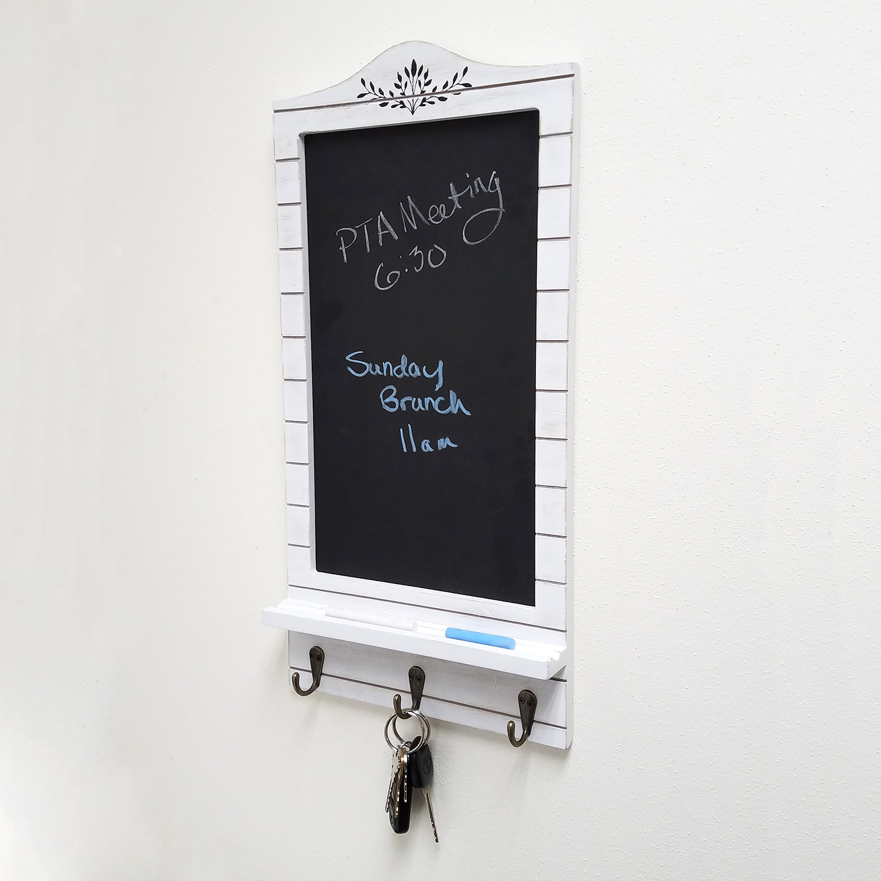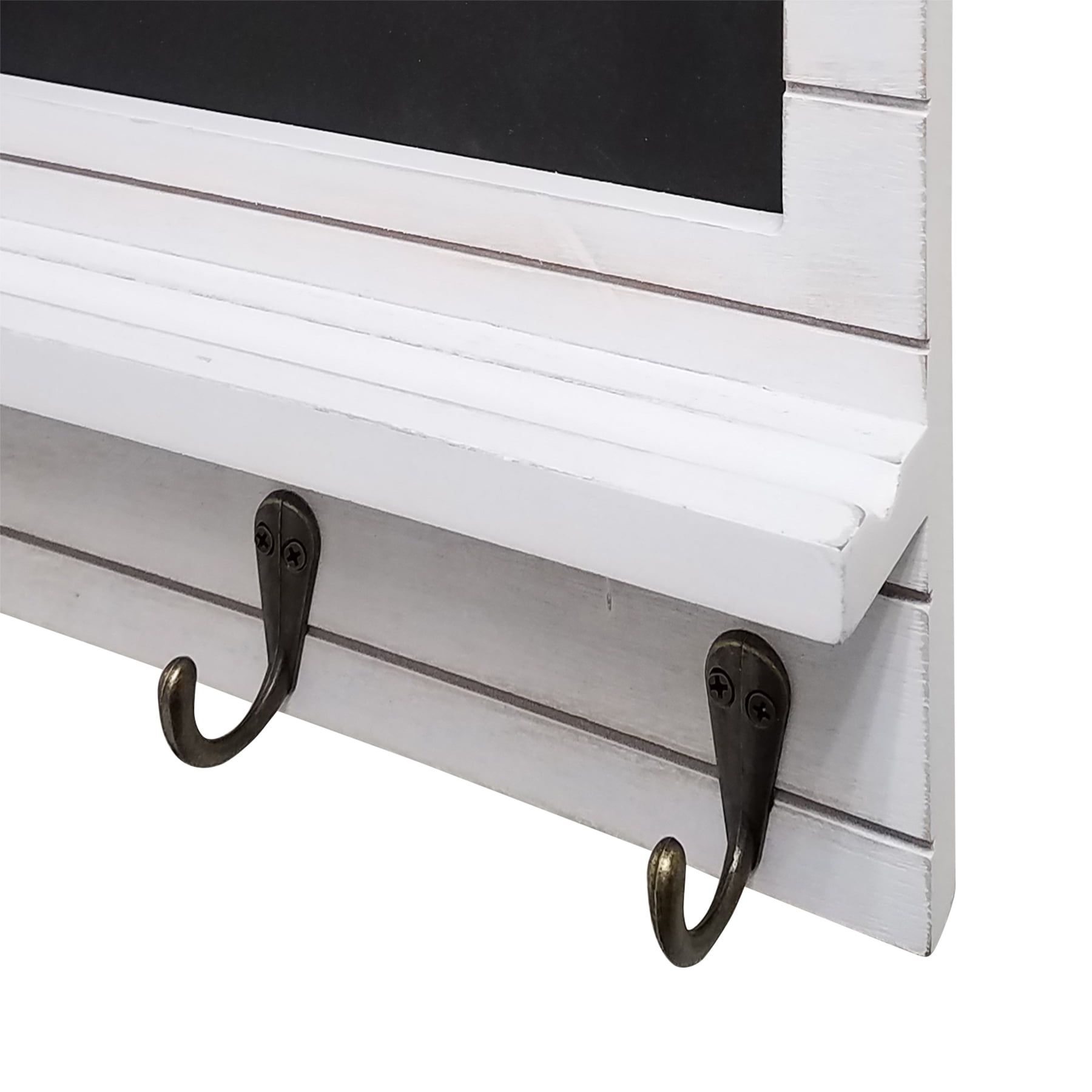 A decorative chalkboard to write your important reminders or positive notes to start off your day. The board also has three hooks so your days of searching for your keys are over. The hooks are great for key chains, hats, dog leashes, or other odds and ends that you would like to hang. Beneath the chalkboard sits a chalk ledge for your quick accessibility of your chalk or chalk pens. This functional board has a distressed white rustic finish and two sawtooth hangers on the back for easy display.