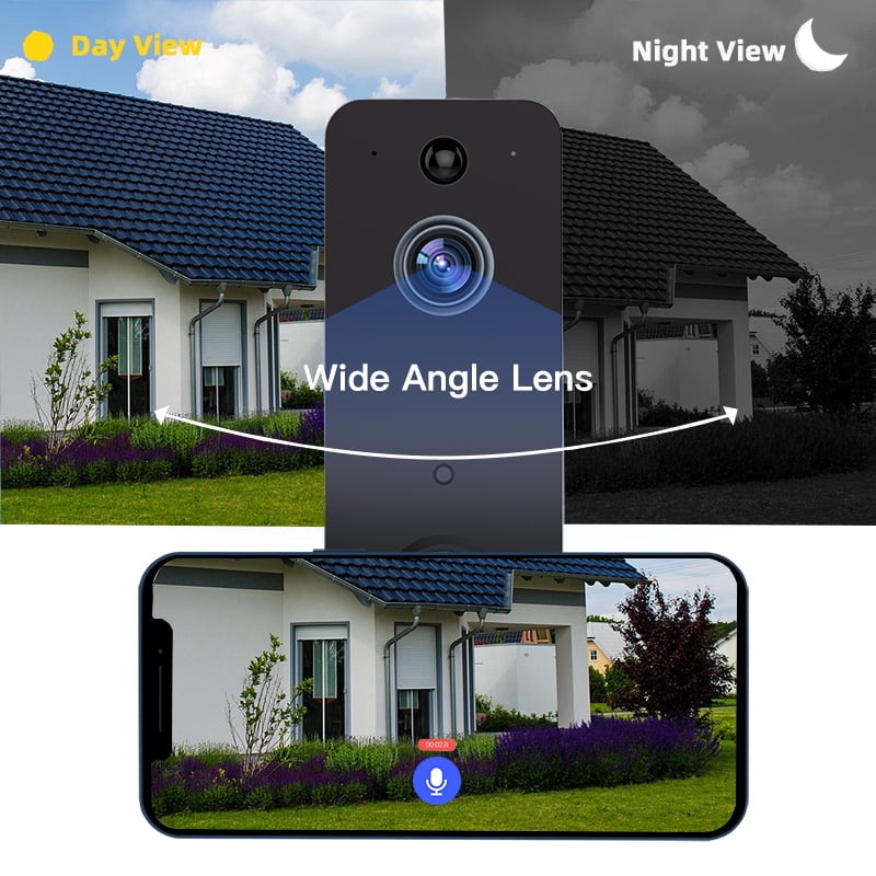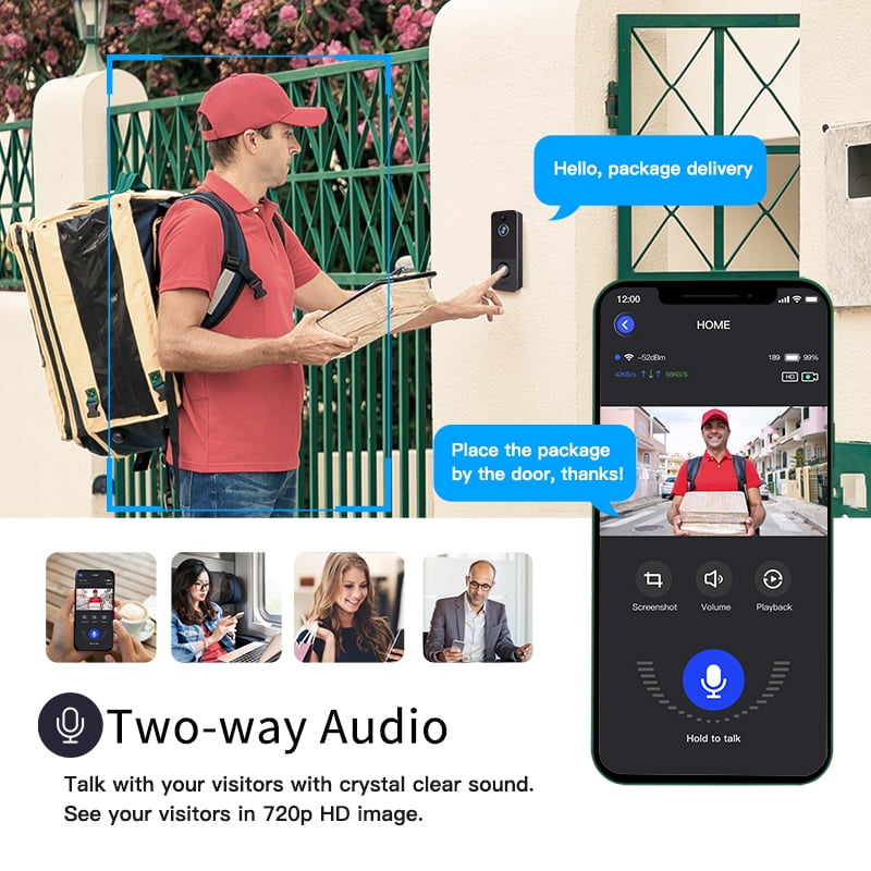Two-way Talk & Cloud Storage :The doorbell cameras wireless has two-way audio function, which makes it easier for you to talk to your visitors or strangers anywhere, anytime. Every valuable events happens at your door will be recorded by the doorbell camera and saved in cloud. No need to worry about losing the videos, or someone stealing your hardware, because you got everything safely saved in cloud.