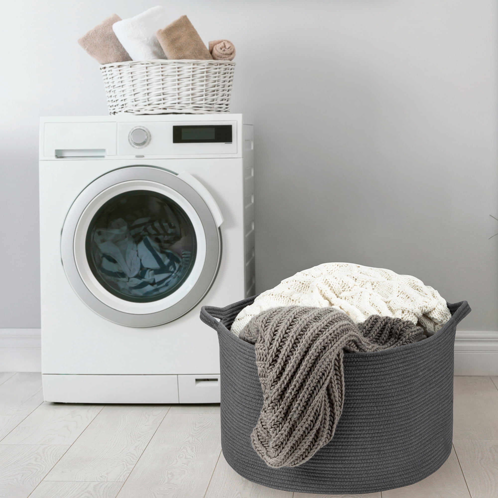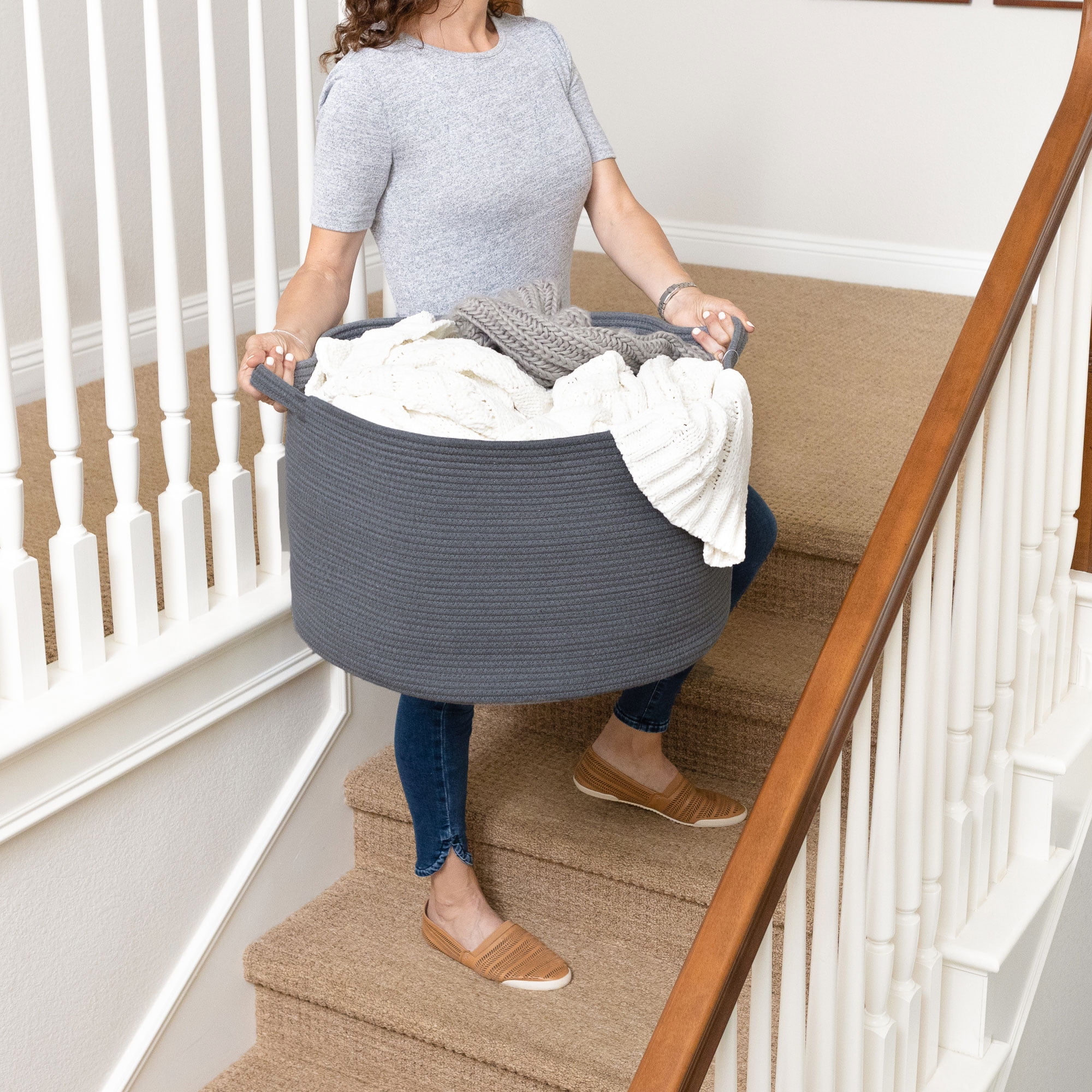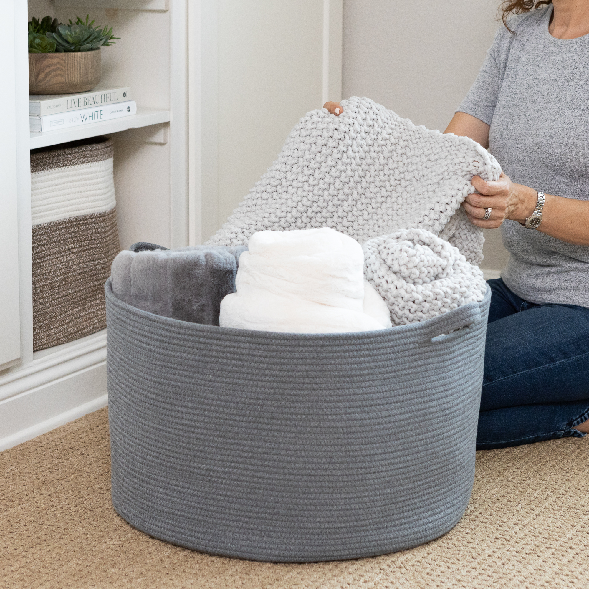 - OVERSIZED AND MULTIPURPOSE ORGANIZING: Whether you need a toy organizer, a towel storage, a large basket for blankets and pillows, or a comforter storage, this big woven rope basket is definitely a smart and ergonomic way of neatly organizing all sorts of items! This clothes hamper measures 14" height x 22" wide and comes with an easy to match color, being suitable for any style, from farmhouse décor living room storage to laundry room storage.