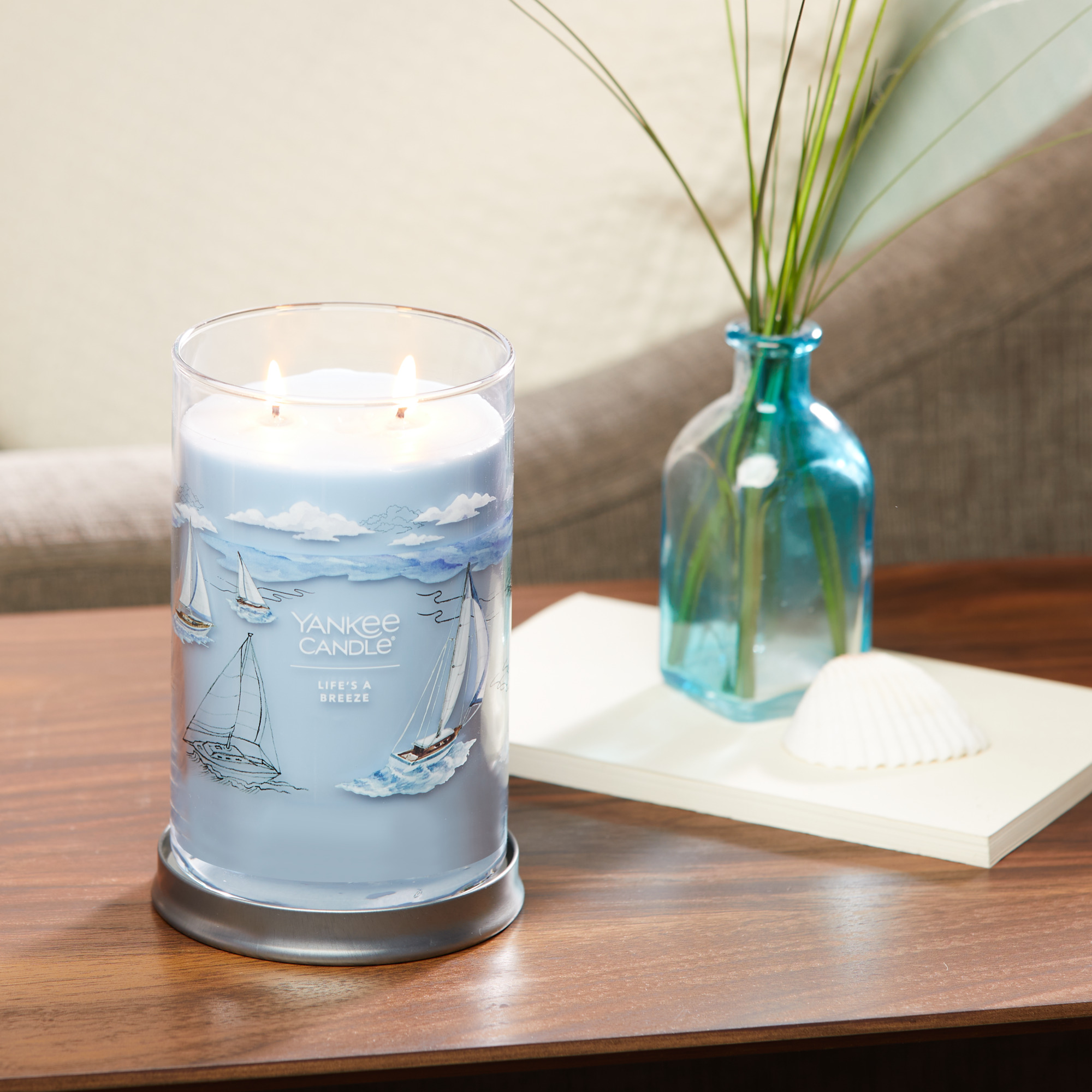 Experience the Yankee Candle® brand, totally reimagined. A fresh take on our Tumbler shape features a brushed tin lid that fits neatly under the base to serve as a candle coaster. Two cotton wicks and a premium soy-wax blend provide a clean burn. Hand-illustrated labels and vibrant wax colors are perfectly matched with Collection-exclusive and tried-and-true fragrances to create an on-trend fit for your home.