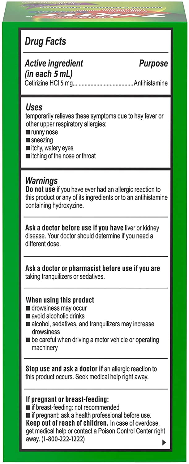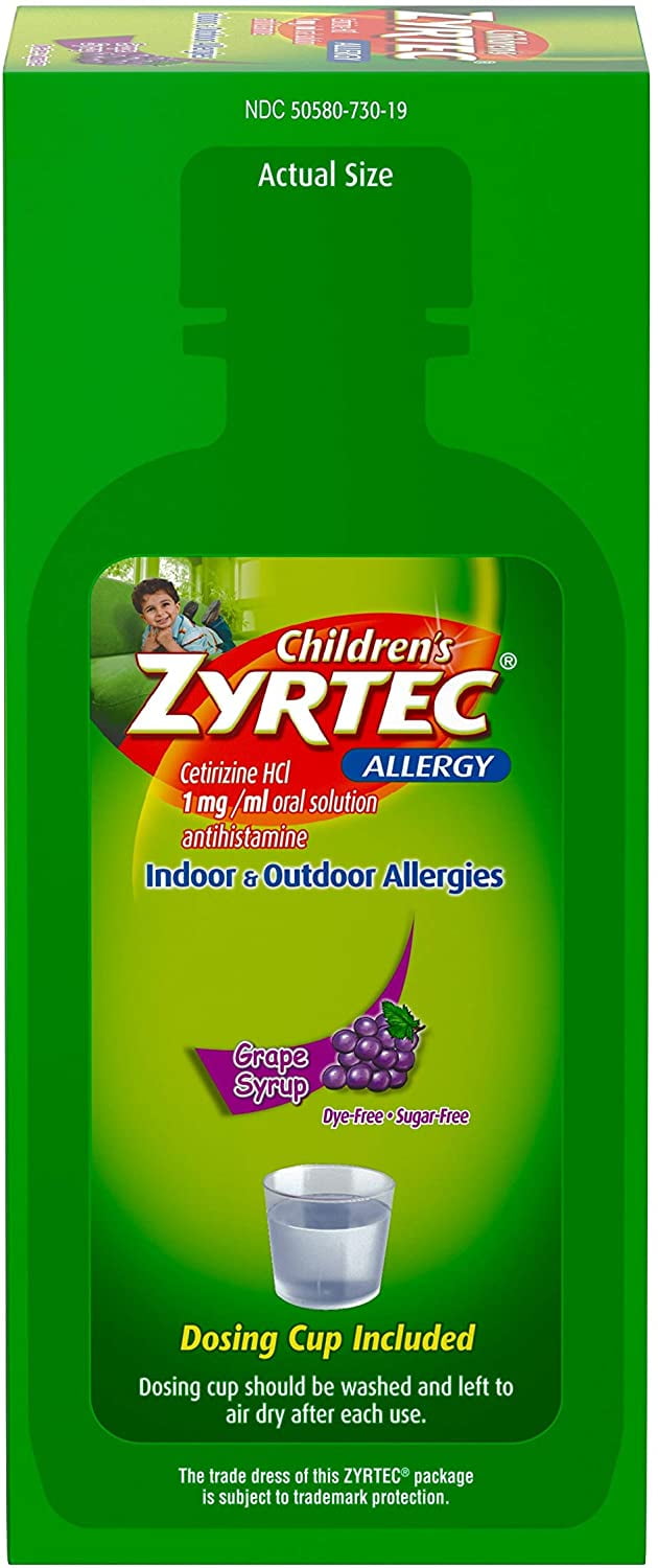 - Zyrtec 24 Hr Children’s Allergy Syrup with Cetirizine, Dye- & Sugar-Free, Grape Flavor 4 oz (Pack of 2)