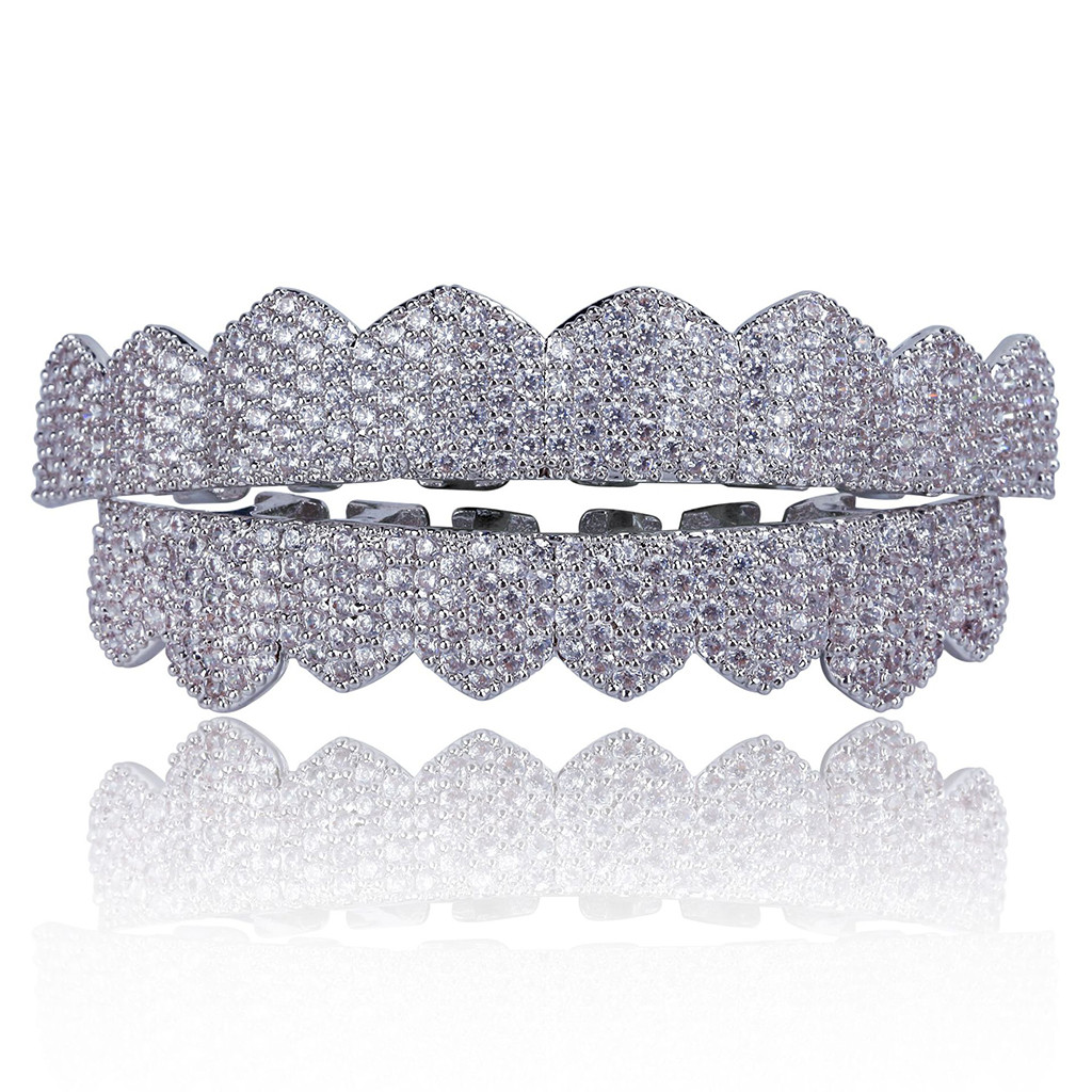 〖Hellobye〗Hip Hop Grills Set Silver Iced Out Micro Pave Top And Bottom Grillz 8 Teeth